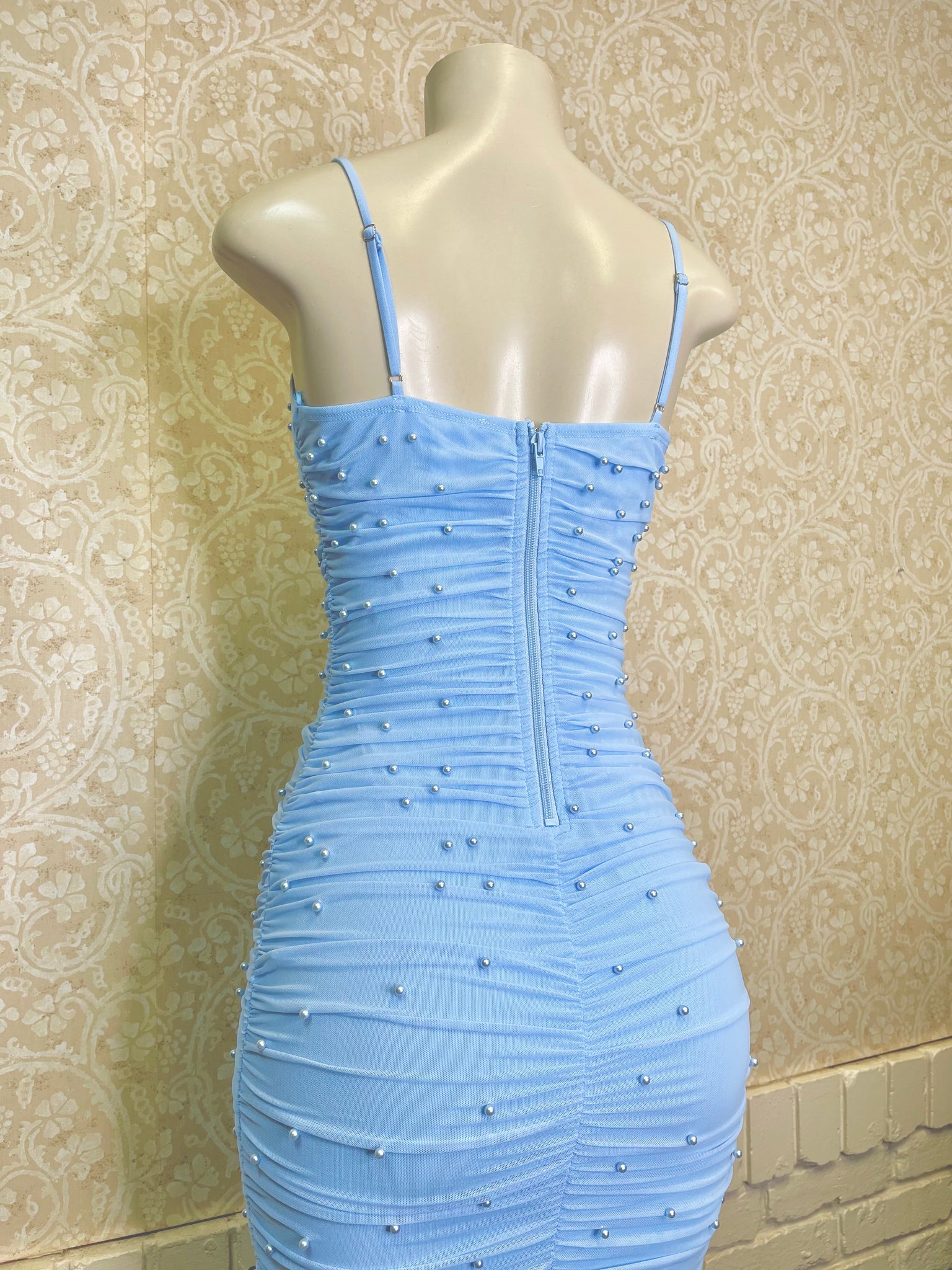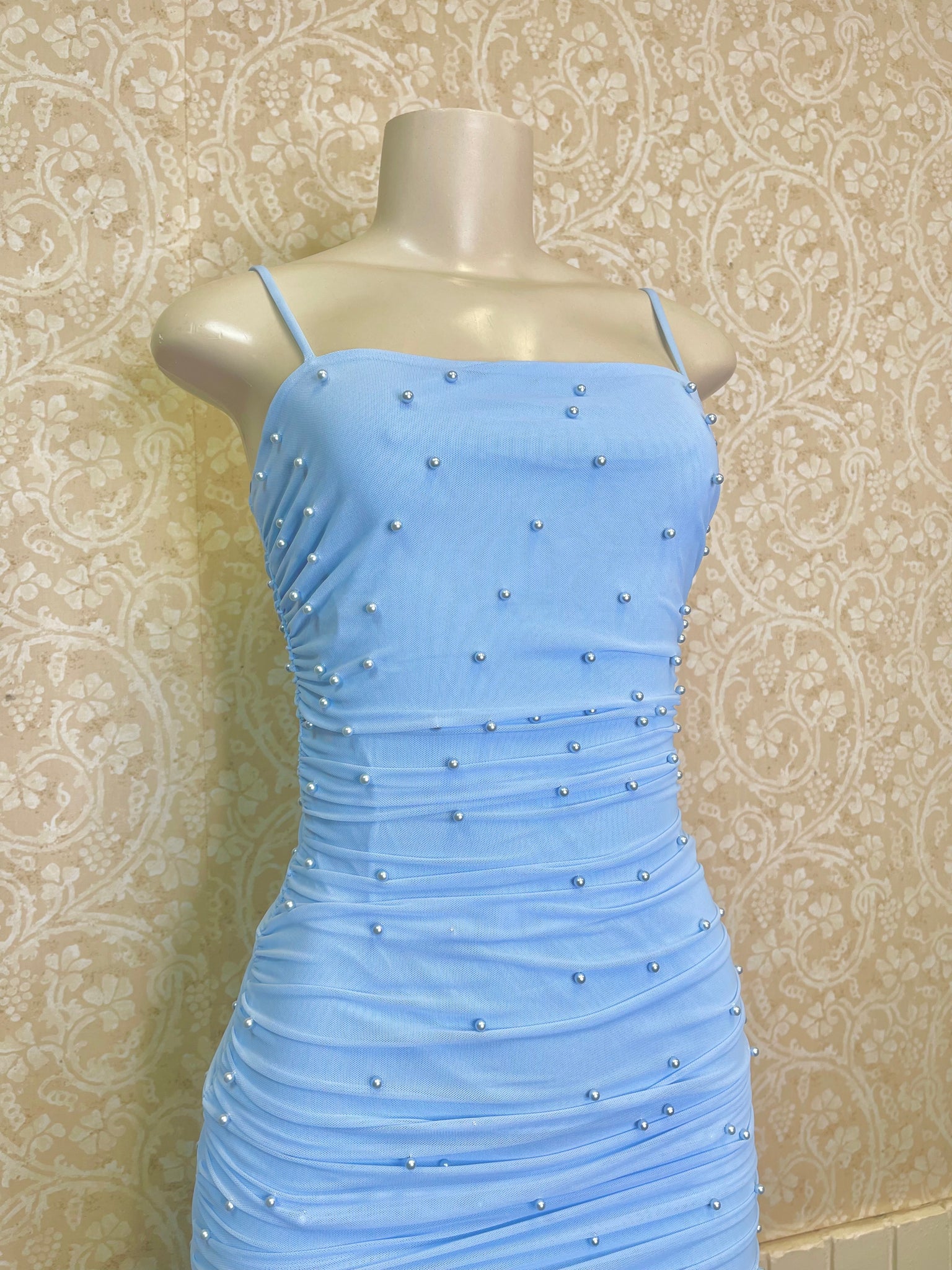 This baby blue long bodycon dress features a breathable mesh fabric embellished with delicate pearls, creating a playful yet elegant look. Its sleek silhouette hugs your curves, making it perfect for turning heads at any event while keeping a fun and flirty vibe.