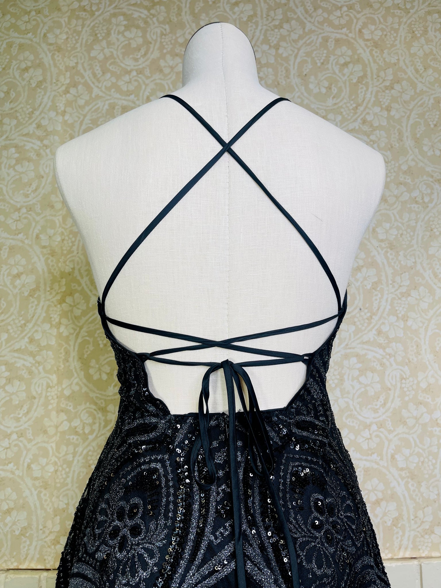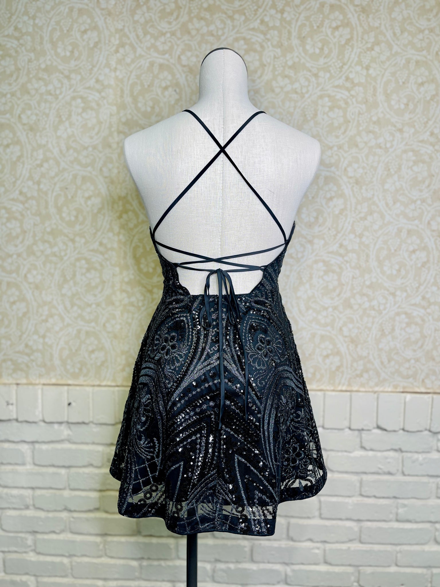 This black sequin mini dress brings fun and flair with its sparkling A-line shape and playful open back. The crossed ties add a flirty touch, making it the perfect choice for dancing the night away in style.