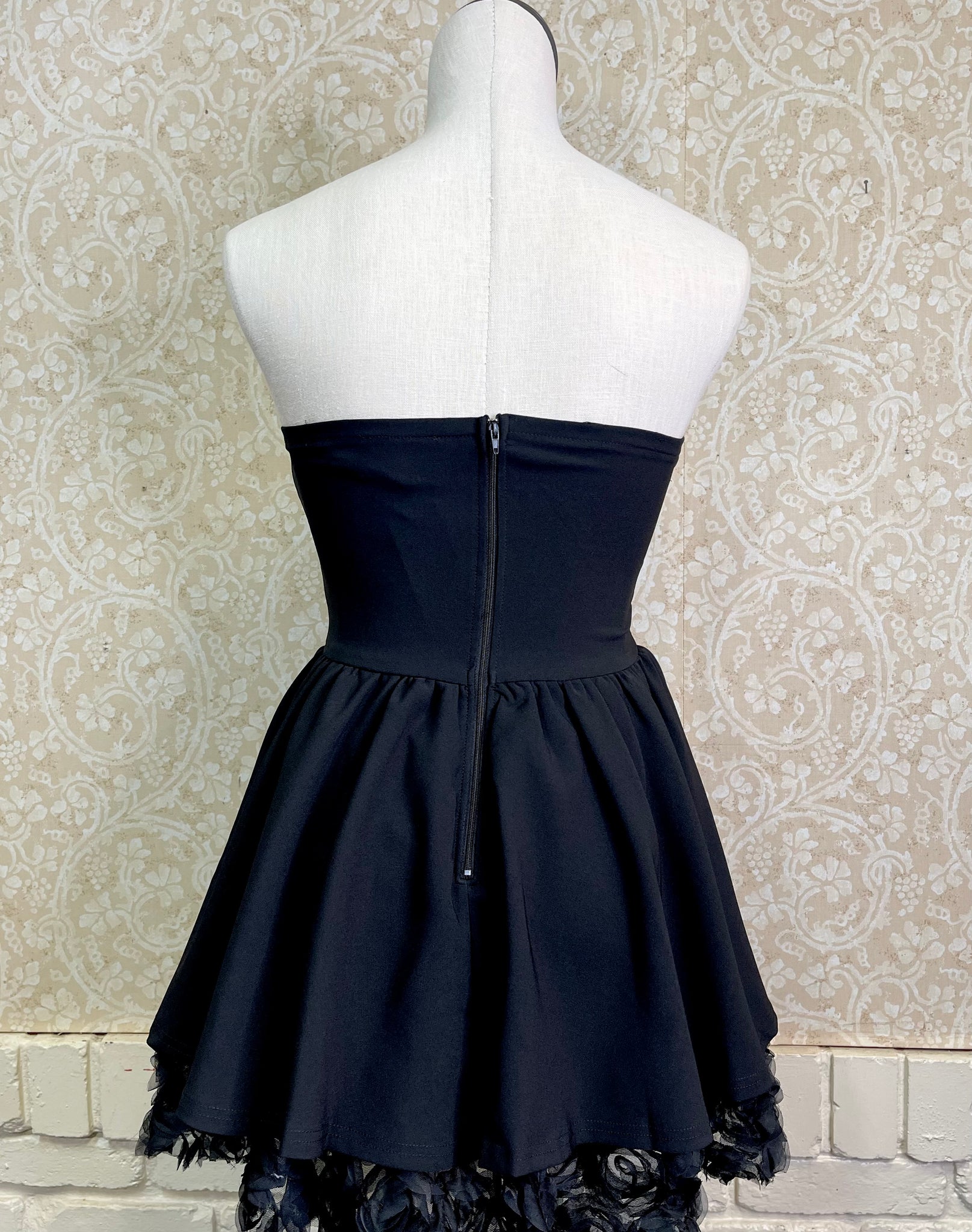 Step out in style with this playful black mini dress featuring a unique textured fabric and a charming rose hem. Its A-line silhouette flatters every figure, while the tube design keeps it sleek and fun. Perfect for parties or a night out, this dress combines comfort with a flirty edge.