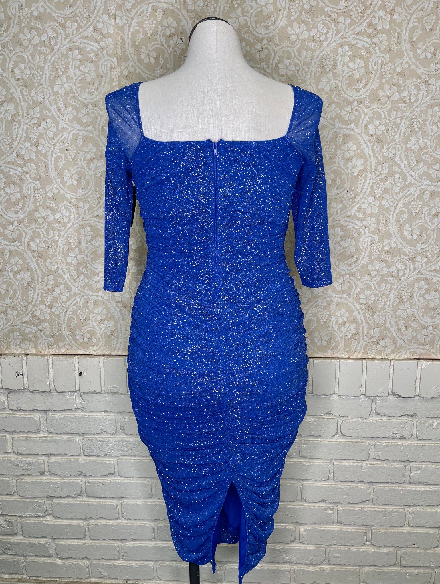 Sparkle and shine in this playful blue glitter dress featuring a flattering sweetheart neckline and chic 3/4 sleeves. Its bodycon fit hugs your curves for a confident, dazzling look perfect for parties or nights out.