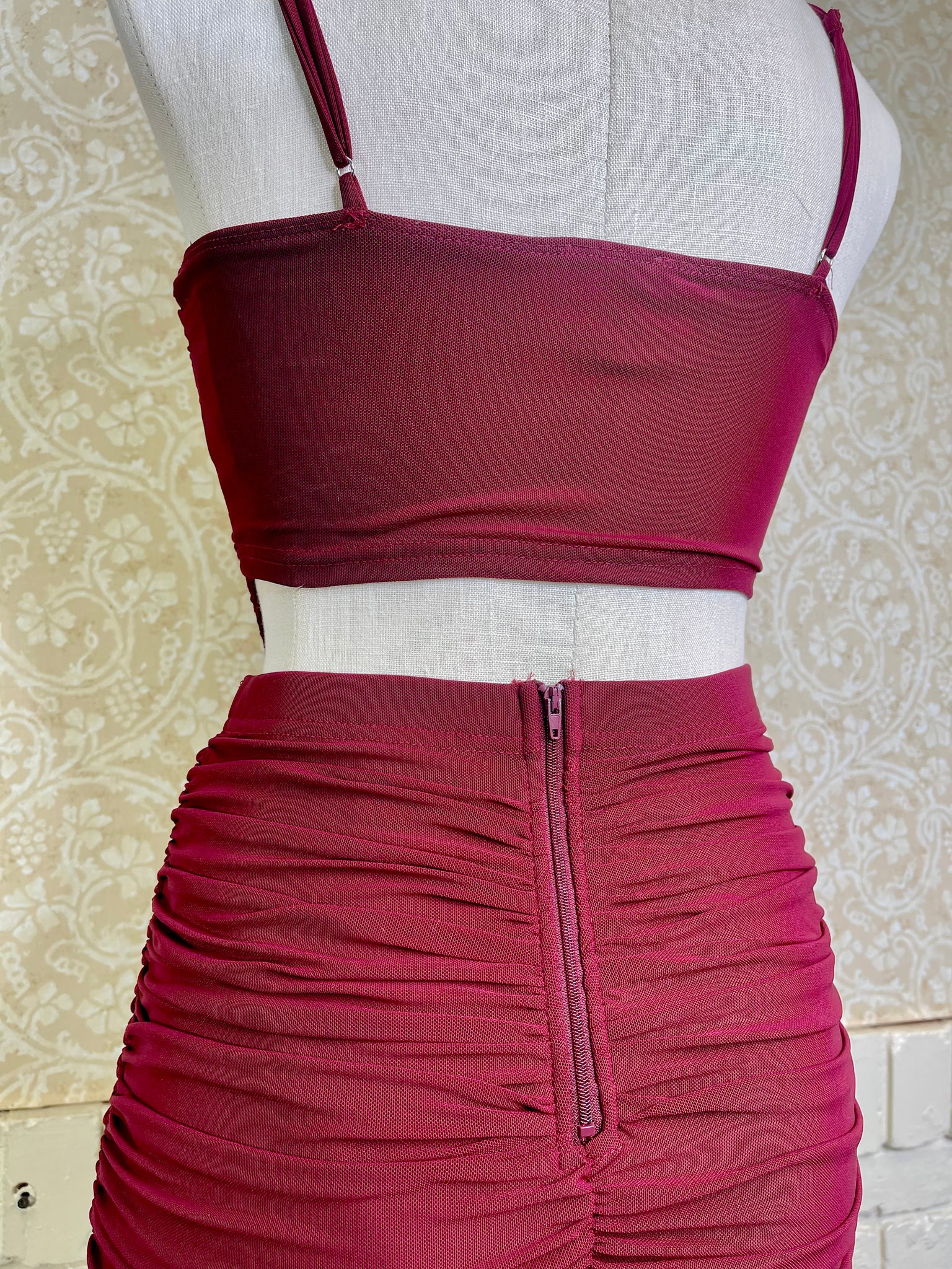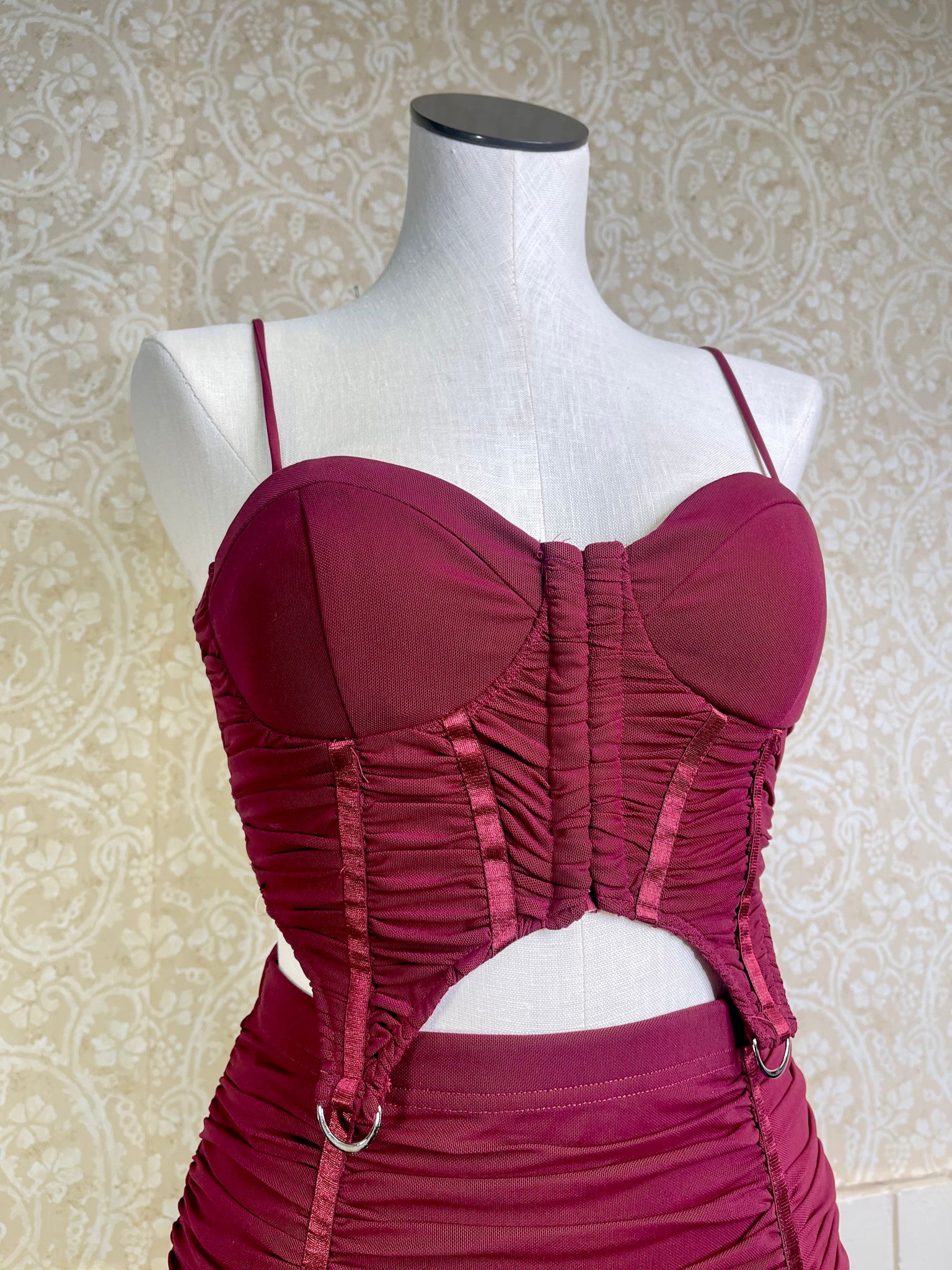Add a touch of fun to your wardrobe with this burgundy corset top and skirt set. The ruched sides create a playful silhouette that hugs your curves beautifully, making it perfect for parties or a night out. Embrace confidence and style with this flirty, eye-catching duo.