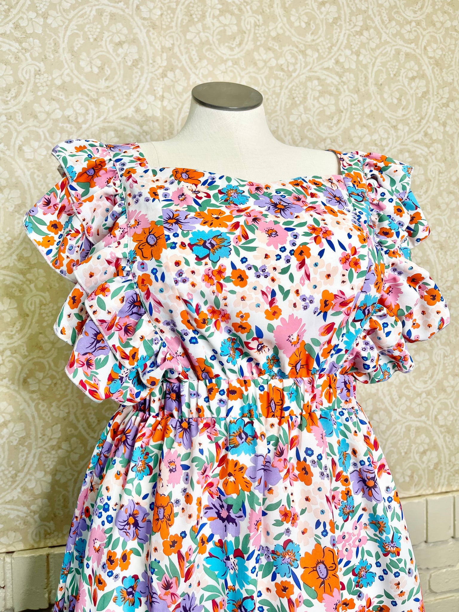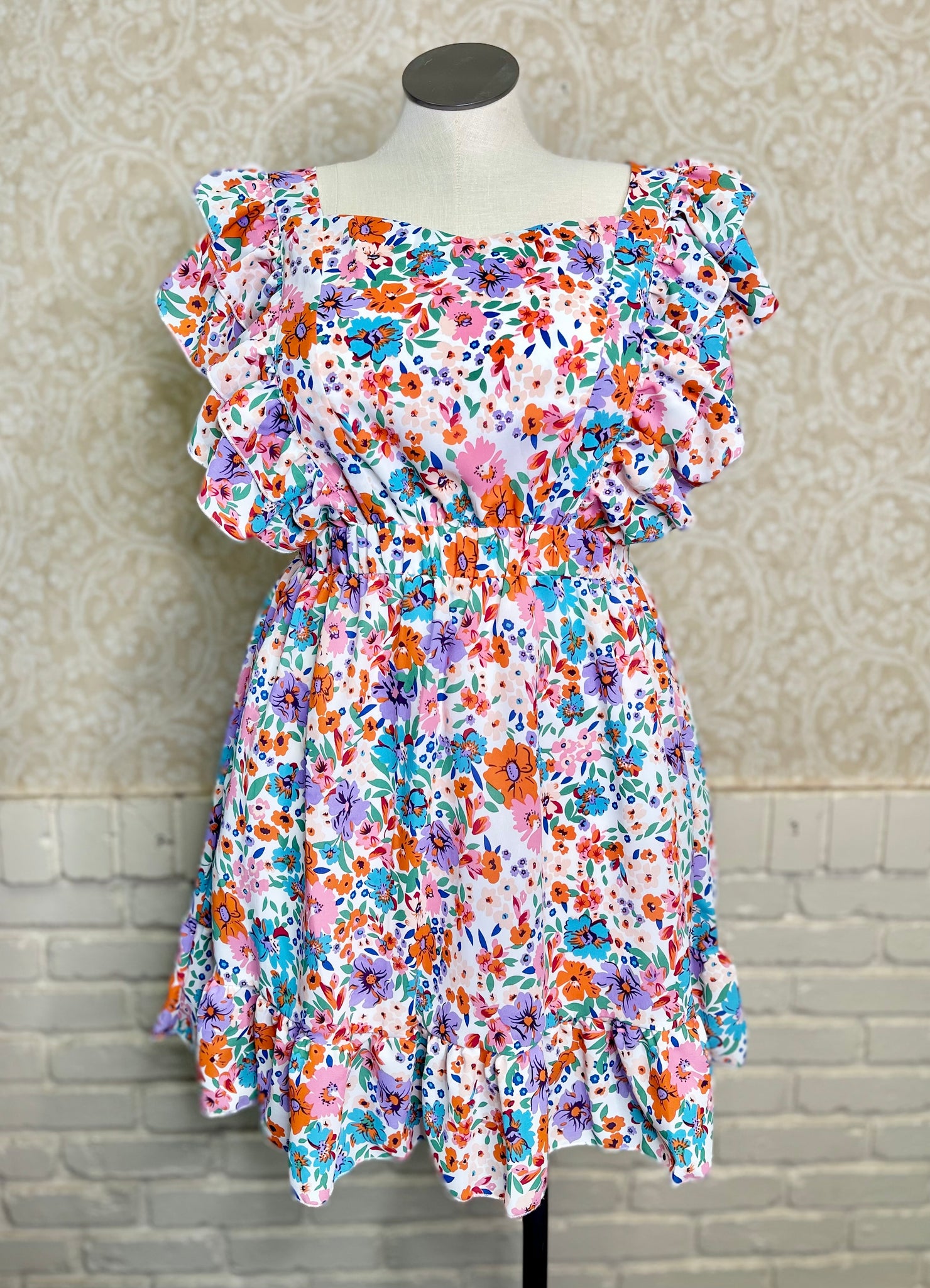 This playful flower dress features charming ruffles on the sleeves and delicate ties at the back, adding a flirty touch to your look. Its light, breezy design makes it perfect for sunny days and casual outings, bringing a fresh and fun vibe to your wardrobe.