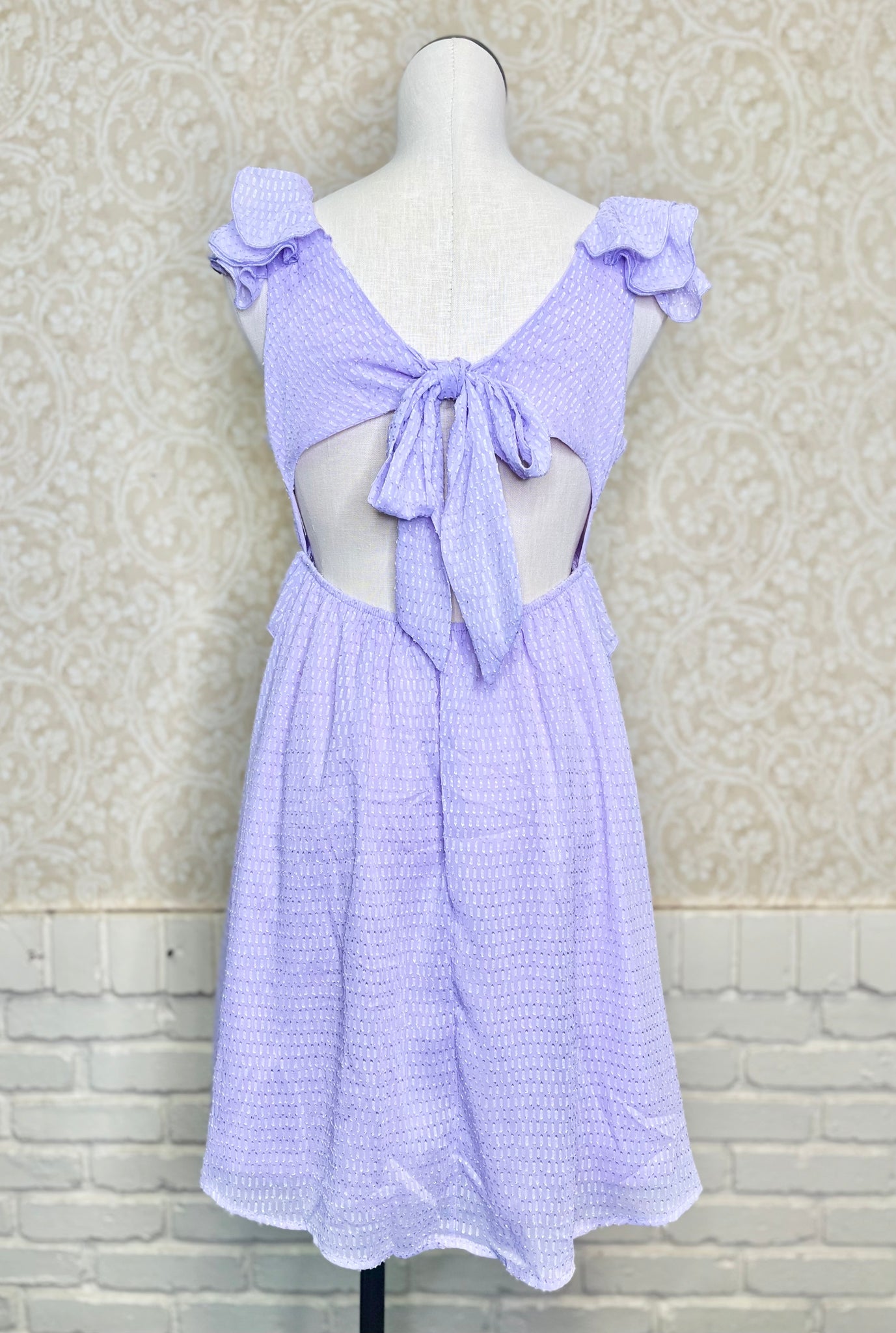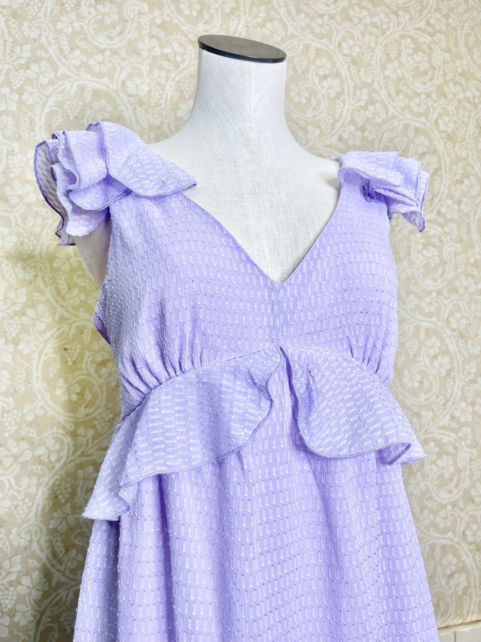 This charming lavender dress features playful ruffled sleeves and a flattering A-line silhouette, perfect for twirling through sunny days or casual outings. Its soft hue and breezy design bring a fresh, fun vibe to your wardrobe, making it an effortless choice for adding a touch of whimsy to any occasion.