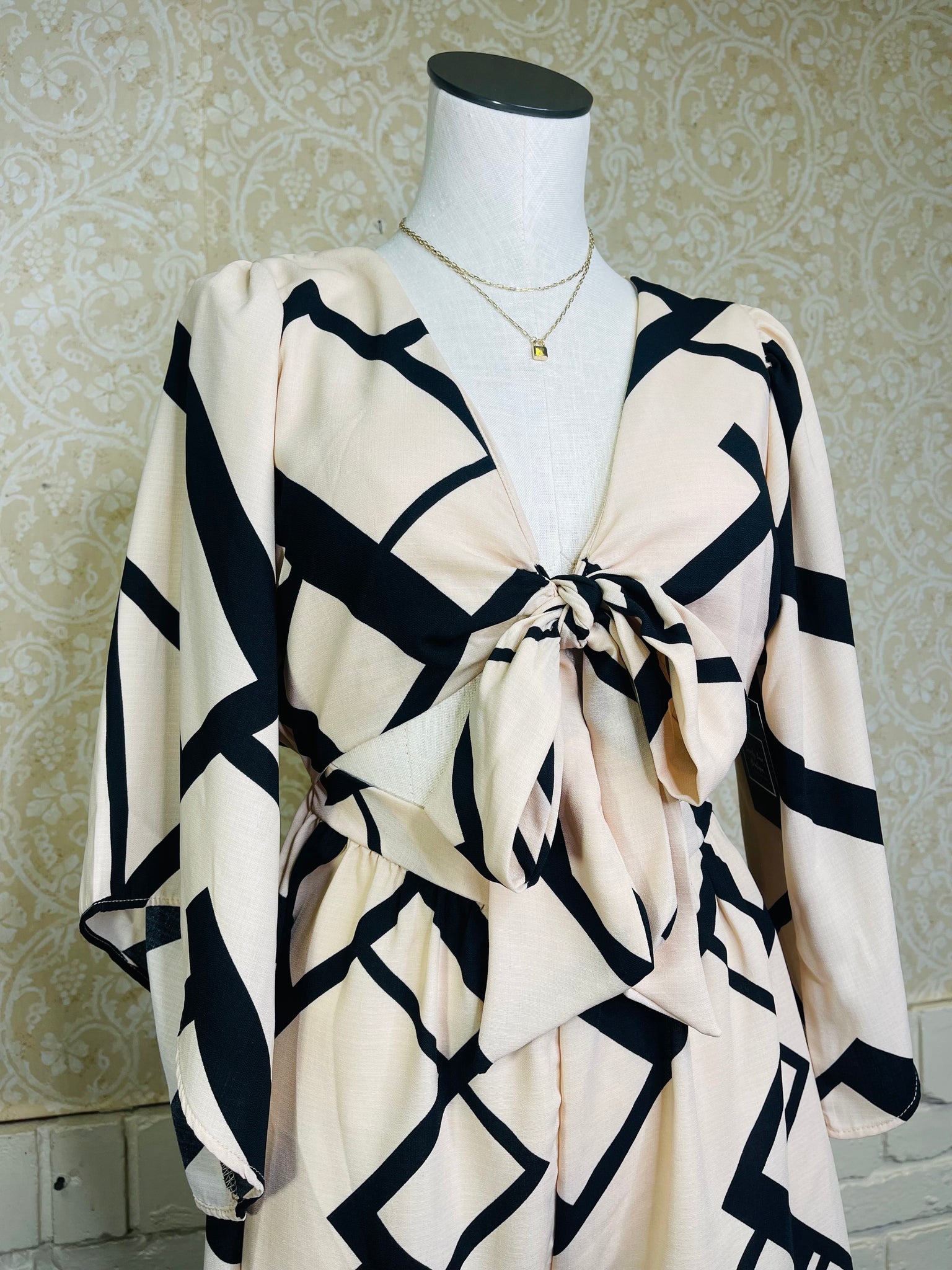 This Linen Front Tie Romper features a charming beige and black striped pattern on the front, tied stylishly around the chest for a flirty, playful look. Lightweight and breezy, it’s perfect for sunny days when you want to stay cool and chic with effortless flair.