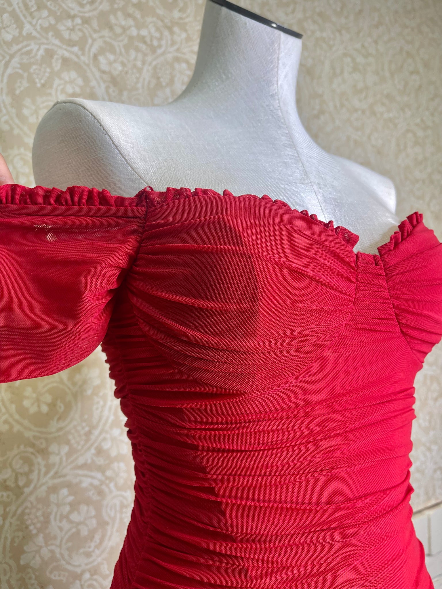 Turn heads in this Red Ruched Off The Shoulder Dress, designed to flatter with its playful ruched sides and chic off-the-shoulder neckline. Perfect for dancing the night away or making a bold statement at your next event, this dress combines comfort with a flirty vibe that’s sure to boost your confidence.