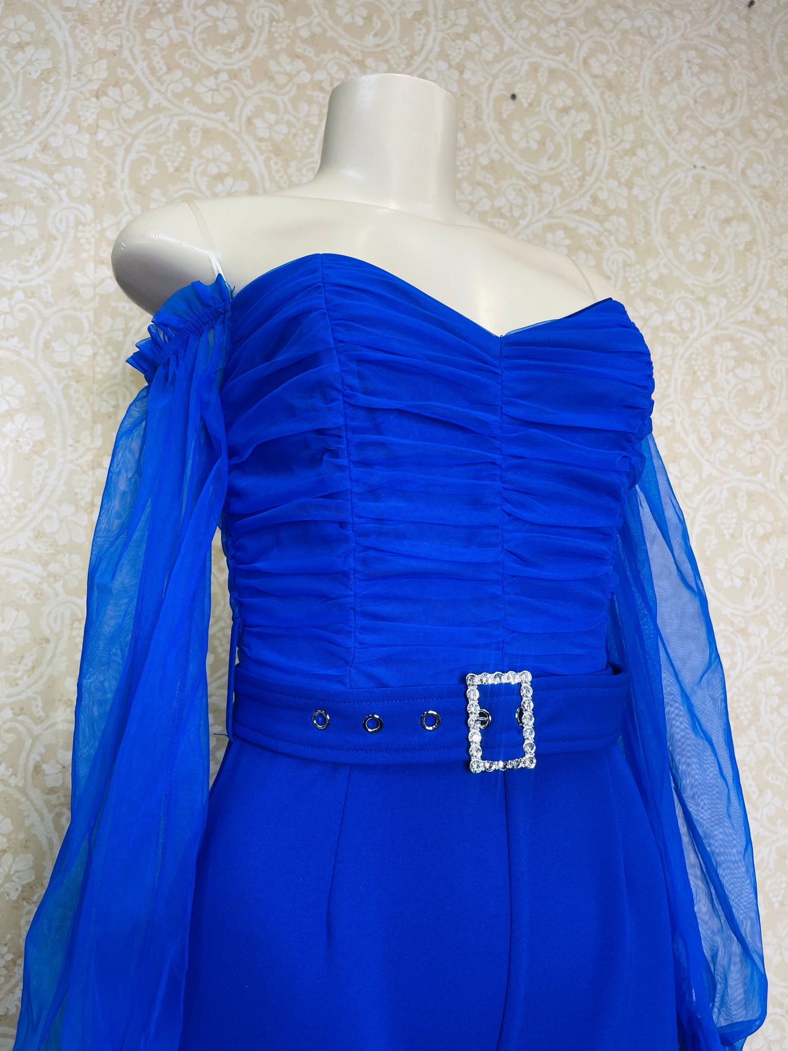 Step out in style with this playful royal blue off-the-shoulder jumpsuit, perfectly accented by a sparkling rhinestone belt that adds just the right touch of glam. Its flattering neckline and vibrant color make it a fun choice for any occasion where you want to shine.