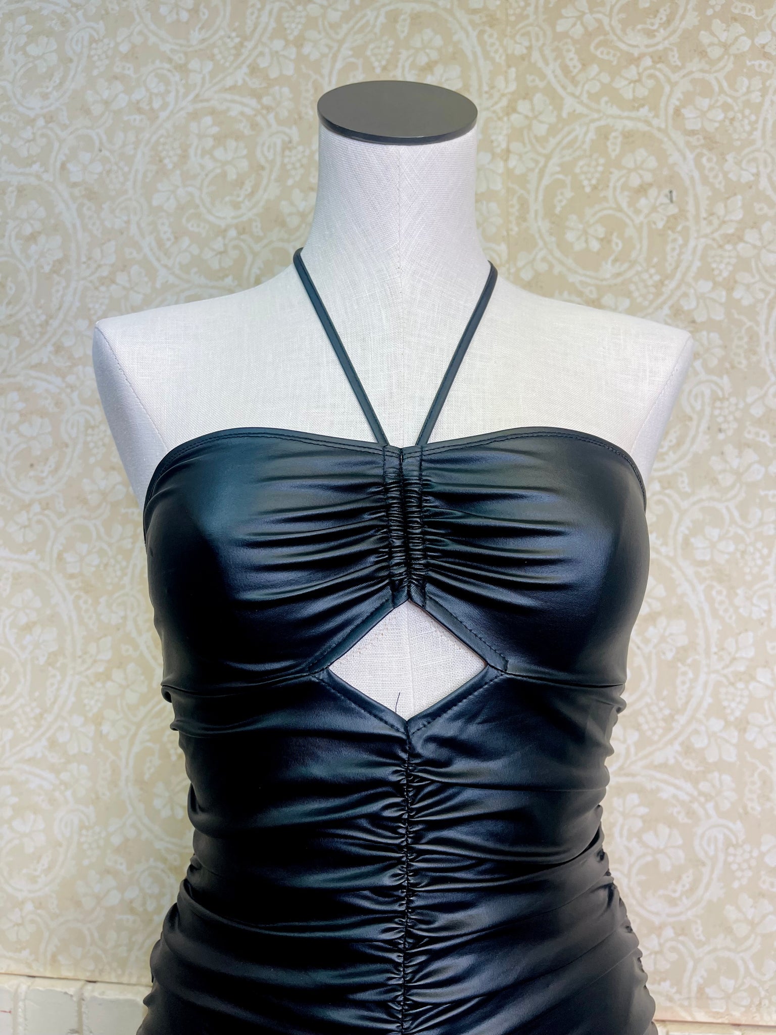 Turn heads in this playful black ruched halter dress, featuring a daring peephole detail just below the chest. Crafted to hug your curves, its sleek leather finish adds an edgy vibe perfect for nights out or special occasions. Embrace confidence and style with this bold statement piece.